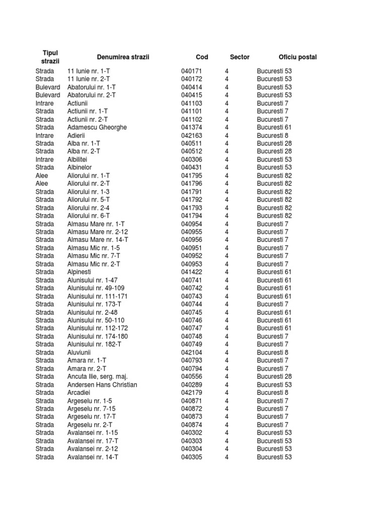 vizitati articolul complet aici : https://philaseiten.de/cgi-bin/index.pl?da=1&F=351&ST=5652&full=1 Cauta in aceasta lista de coduri postale ce are peste 50 000 de inregistrari, codul la strada ta sau la localitatea de care esti interesat. Coduri postale turnu magurele teleorman pentru fiecare strada si oficiu postal. Atunci cand adresa este de forma: